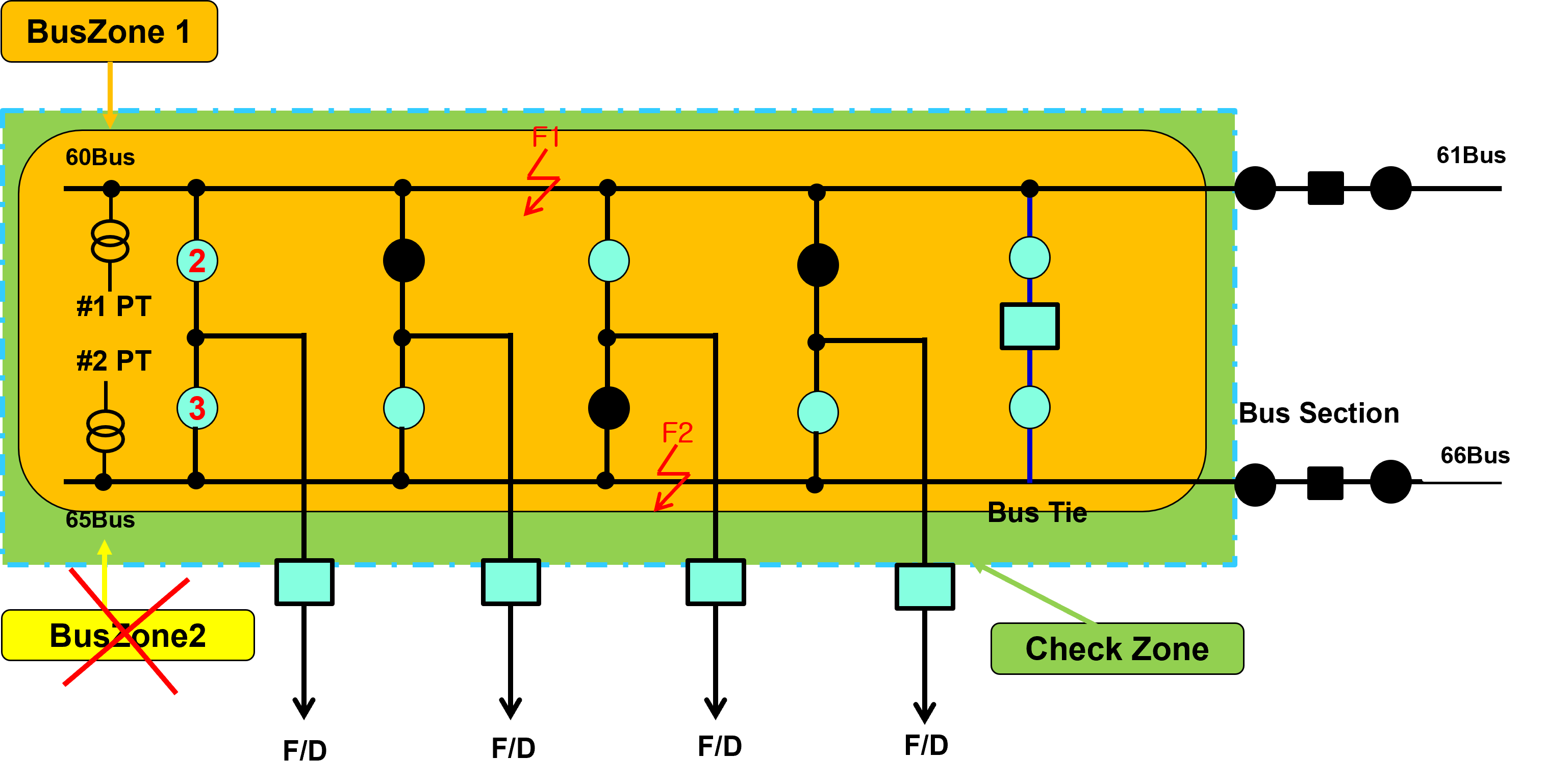 나. F2 고장 시 : 65Bus에 연결된 F/D와 BusTie CB 는 Trip.