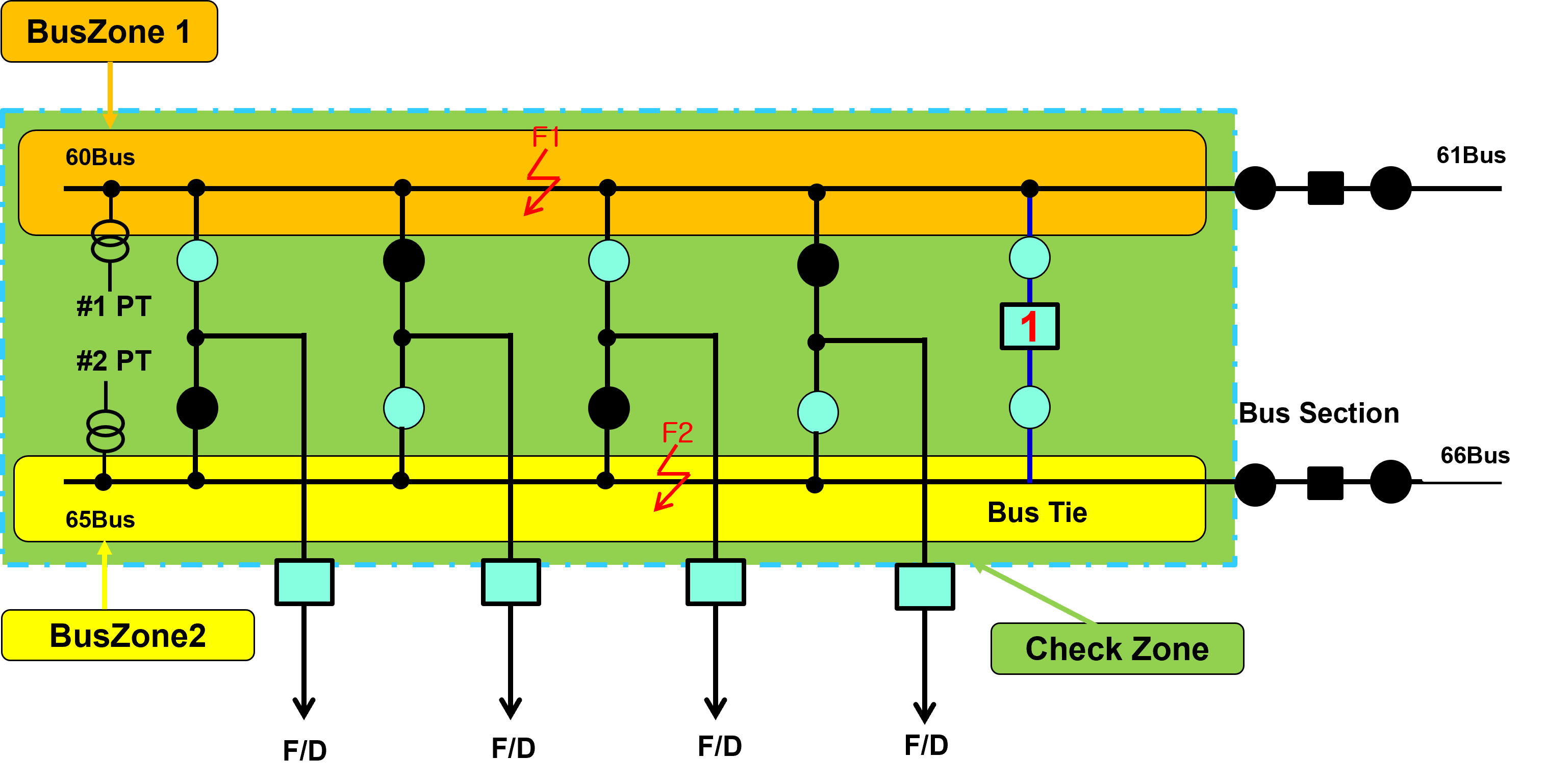 위 그림과 같이 첫번째 F/D 2,3번 DS에 의한 60/65Bus를 Coupling 운전시 모선 보호계전기는 Bus Zone1/ Check Zone으로 연산합니다.