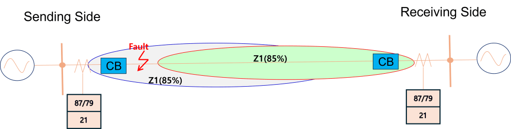 - Sending Side의 Zone 1 보호는 고장을 검출하고 차단기를 작동시키며 재폐로가 수행됩니다.